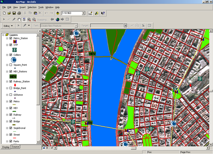 When creating the Navigator, GIStance first acquired a satellite image of Budapest. Using a GIS software package from ESRI and this satellite image, we created a vectorized database by drawing lines over all of the streets and public transportation routes at high resolution. Similarly, colored polygons were drawn over parks and water areas. Point layers may be used to mark specific areas of interest such as banks, gas stations, real estate, or store locations. Figure 1 shown to the right provides an example of how we used a satellite image to build our digital map of Budapest.